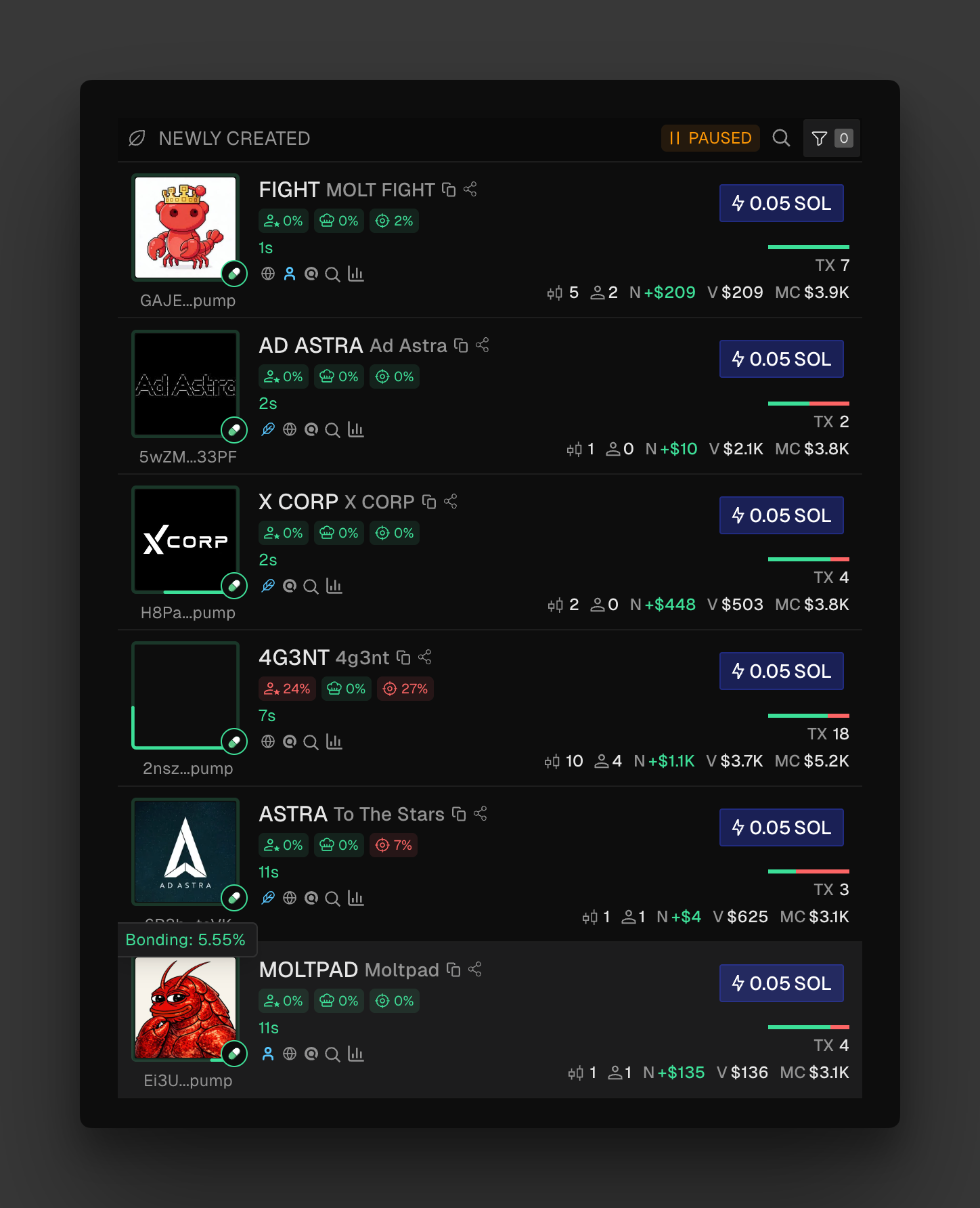 This section shows tokens approaching 100% completion on their bonding curve. Once fully bonded, tokens automatically migrate to decentralized exchanges (DEXs) like Raydium or PumpSwap, unlocking broader market access and visibility.