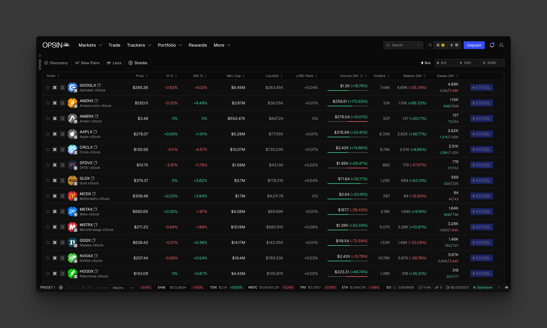 OPSIN currently supports trading through xStocks, Paimon Finance, and Ondo Finance. As the terminal expands, all RWA products will be grouped under a dedicated Real-World Assets section, offering streamlined access to this emerging asset class directly within OPSIN.