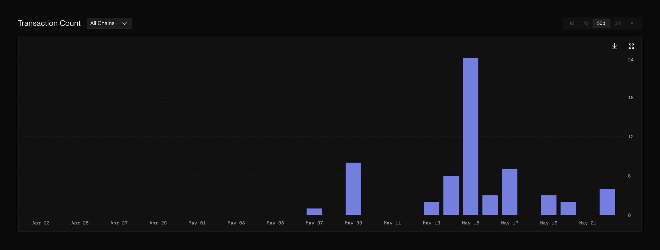 In addition to allocation metrics, you’ll also find an Activity Chart, offering both an aggregated view and a breakdown by chain of the wallet's activity over the selected timeframe. This provides a deeper insight into the volume of transactions executed across any blockchain supported by OPSIN. Hovering over a specific candle will display the relative date and a detailed breakdown of the number of transactions performed.