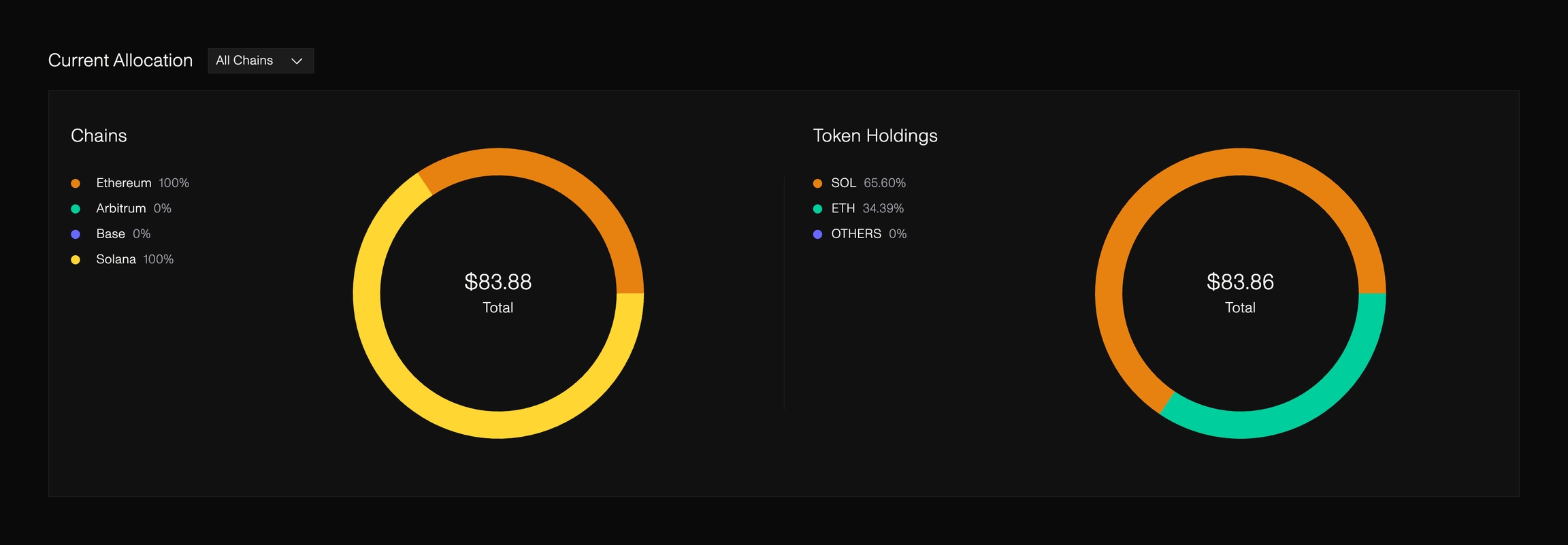 The analytics page serves to help you grasp more in-depth analytical insights about your general account and portfolio composition. You can view your holdings broken down by chain as well as current portfolio % composition across different assets;