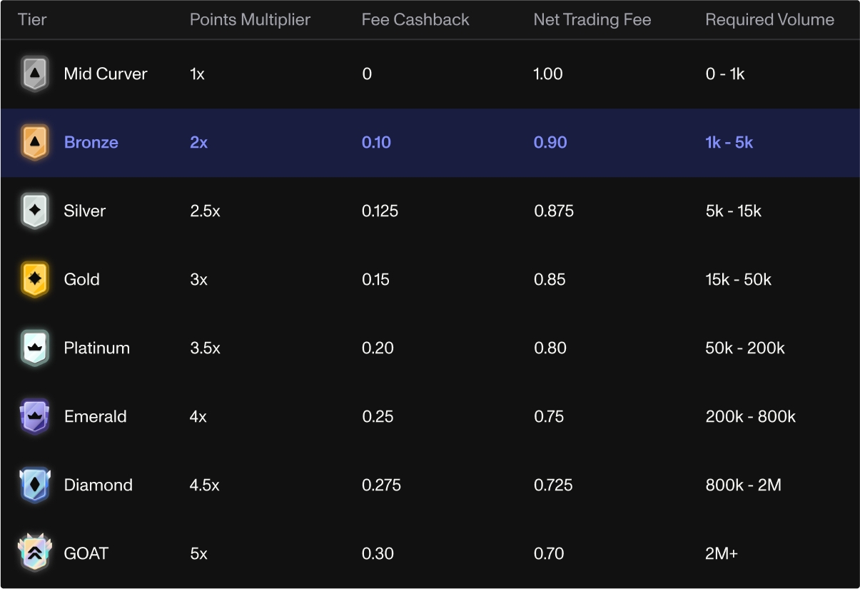 We're rewarding our active users with a tier system. Tiers are based on your trading volume, the higher the tier the bigger the fee discounts and points multipliers..