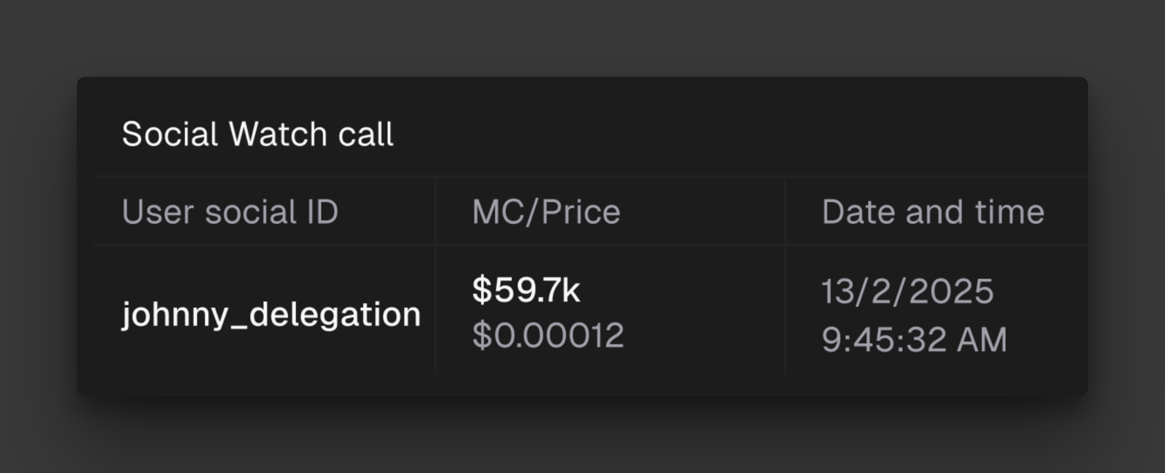 If a specific user tracked in Social Watch calls / has called the specific token, its social icon will appear on top of the chart. Hovering on it will show additional details: